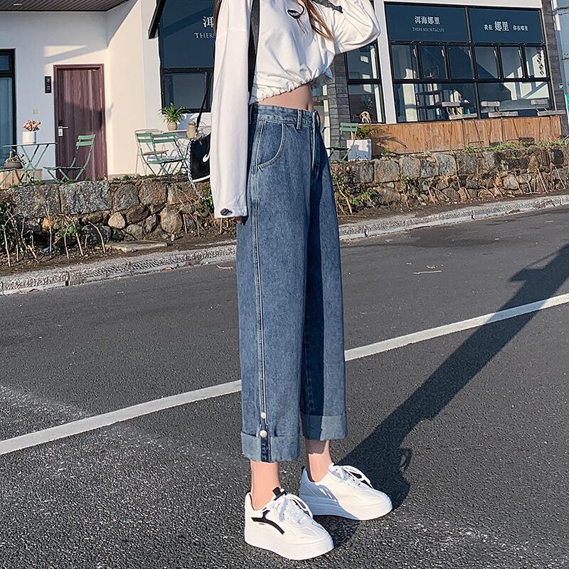 -ウエストストレートレッグジーンズレディースルーズヘミング2021レトロスプリングニューシックシンワイドレッグアウターパンツ 春物 youqi75155817056