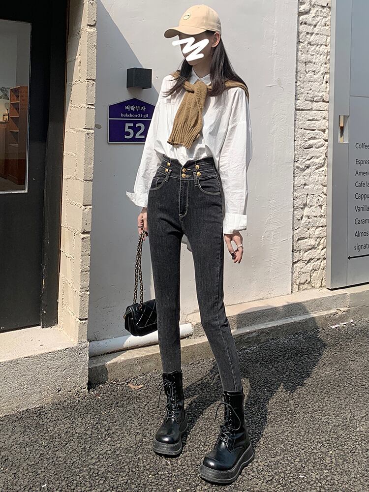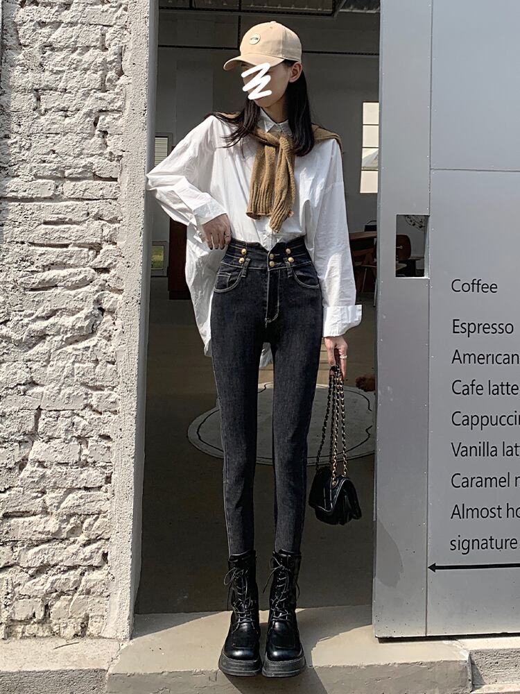 秋と冬のハイウエストジーンズの女性の2021年の新しい春と秋は薄く見えるオールマッチタイトフィットプラスベルベットの足のデザインパンツ ハイウェスト スプリング 春物 オータム 秋物 ウィンター 冬物 youqi86676157069