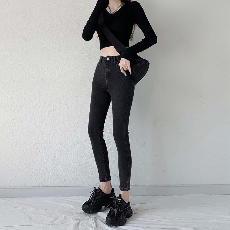 グレーブラックジーンズの女性の春と秋のハイウエスト、薄くて高い伸縮性のあるタイトな足2021新しい秋と冬のパンツ ハイウェスト エラスティック スプリング 春物 オータム 秋物 ウィンター 冬物 youqi48509962801