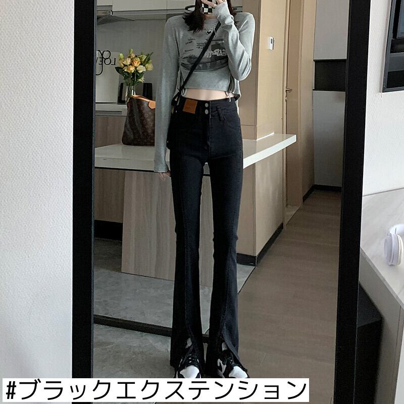 ウエストスリットジーンズ女性の2021年秋冬新作タイトフィットスリムモップマイクロホーンブラック二股パンツ オータム 秋物 ウィンター 冬物 youqi68358179442