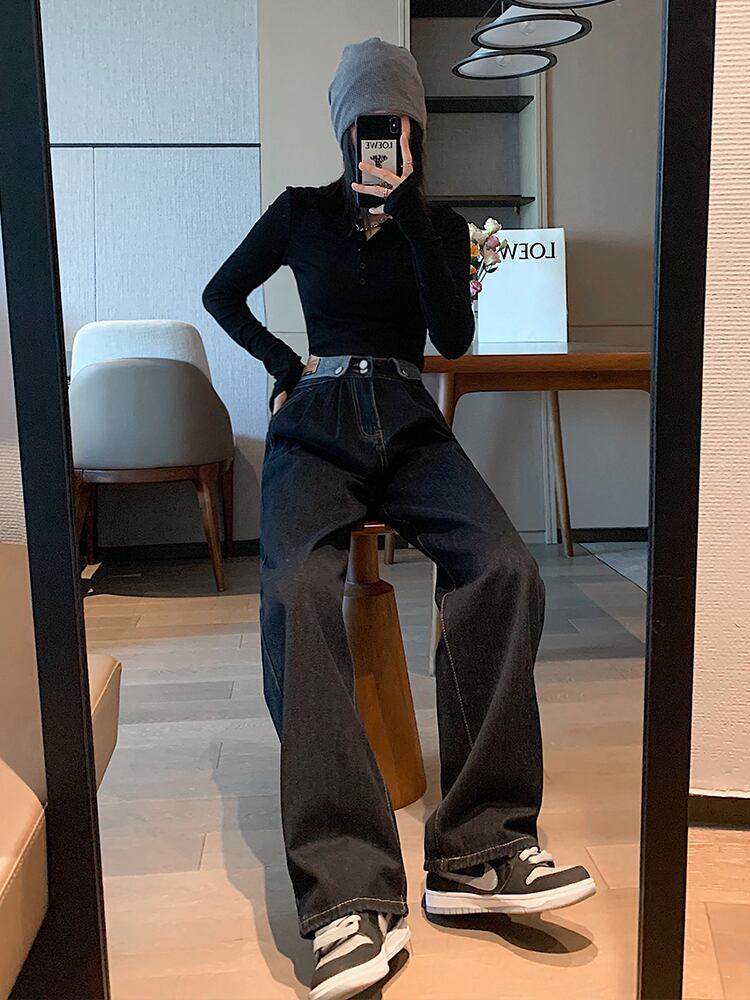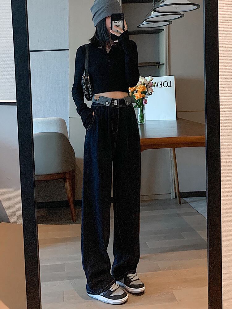 ダークブルージーンズレディースワイドレッグハイウエスト春秋レディース2021新作ルーズドレープモップストレートパンツ ハイウェスト スプリング 春物 オータム 秋物 ワイドパンツ youqi1728740047