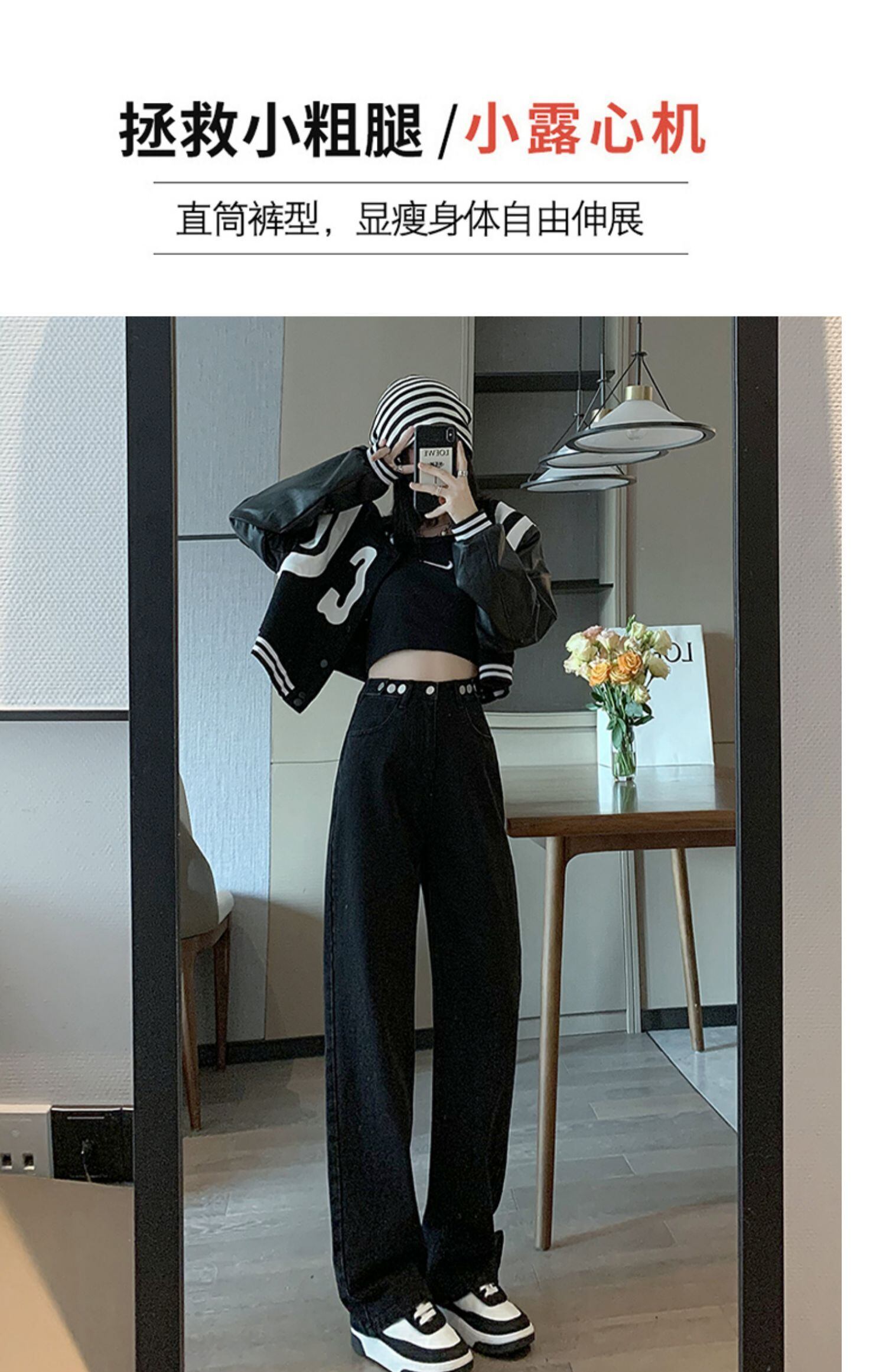 ウエストフリースジーンズレディース秋冬ストレート2021新作ルーズスモールワイドレッグモップブラックパンツ オータム 秋物 ウィンター 冬物 ワイドパンツ youqi95555889815