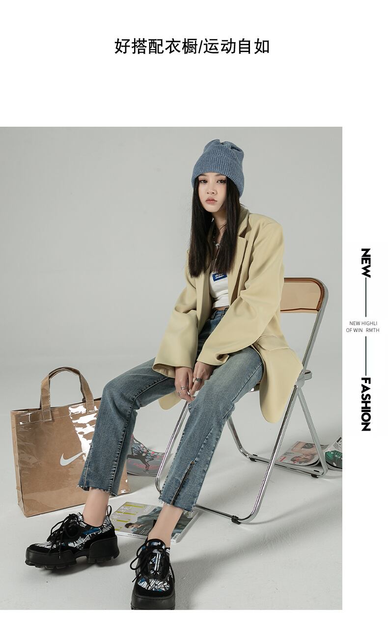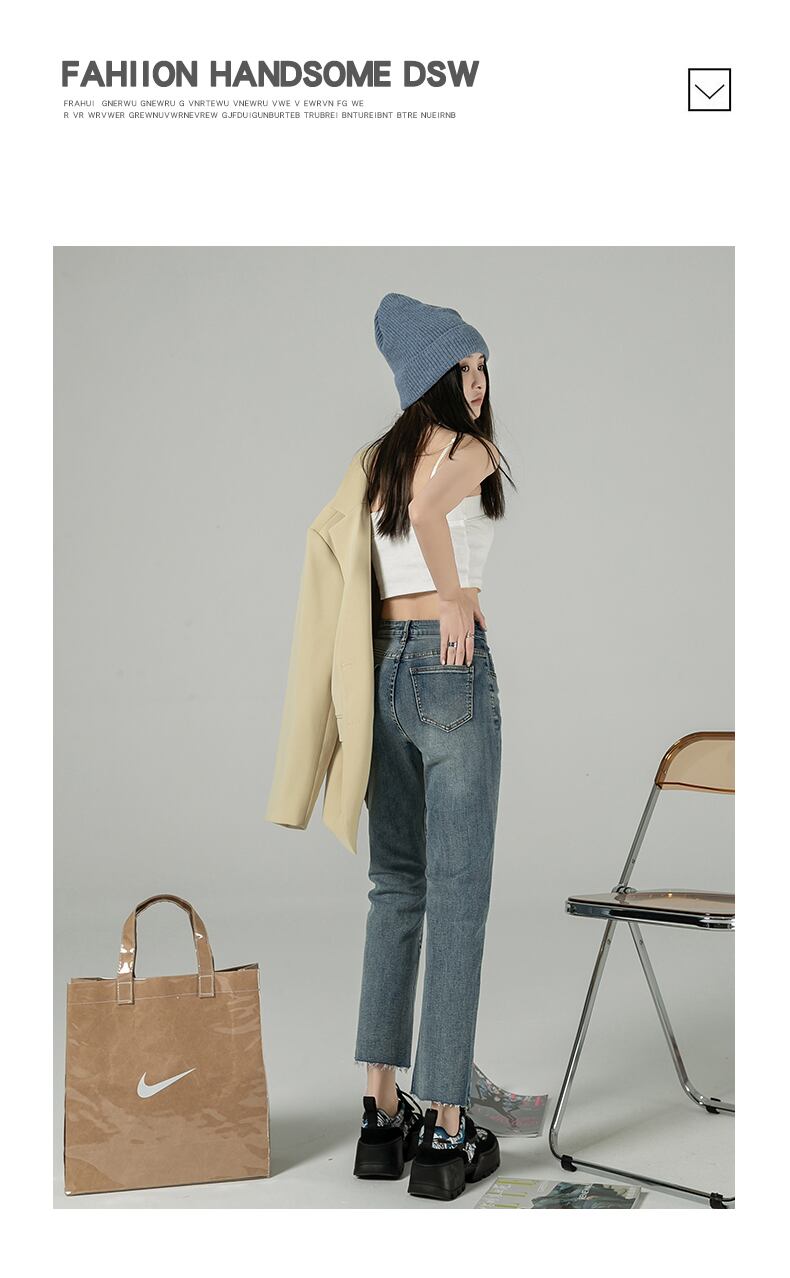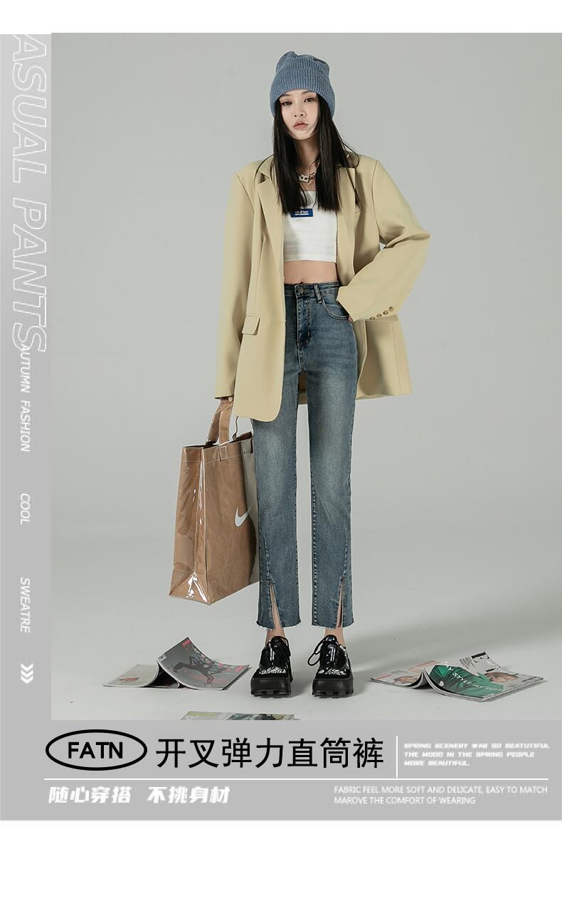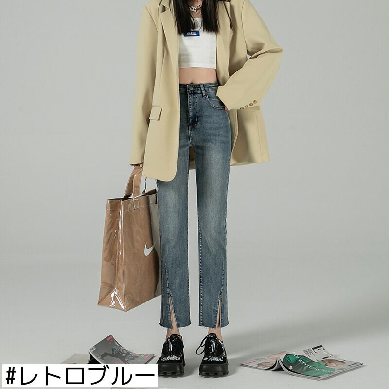 シックな香港スタイルのレトロジーンズ女性の2021年秋ルーズスプリットストレートハイウエストスリム9ポイントシガレットパイプパンツ ハイウェスト オータム 秋物 youqi13479104298