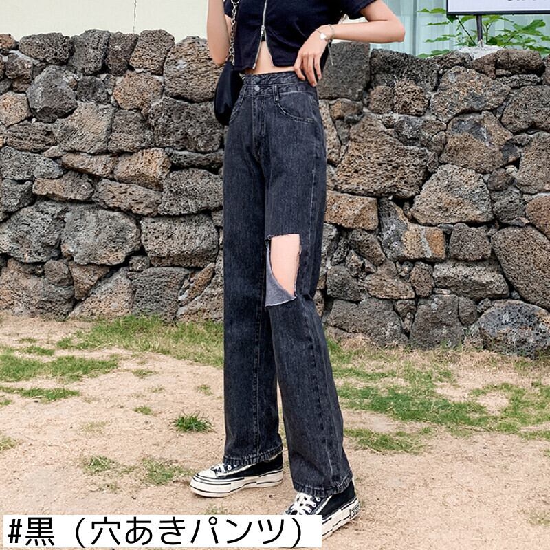 破れたジーンズの女性の夏の薄いセクションルーズ2021新しい薄いストレートブラックネットレッドワイドレッグパンツトレンディ サマー 夏物 ワイドパンツ youqi29549864038