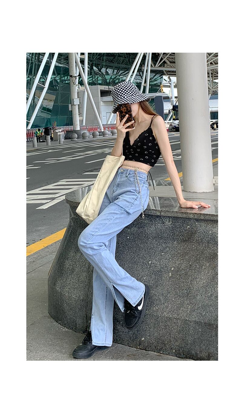 -ウエストリッピングワイドレッグジーンズレディースライトカラーストレート2021新夏ルーズスプリットシンモップパンツ サマー 夏物 youqi33981213849