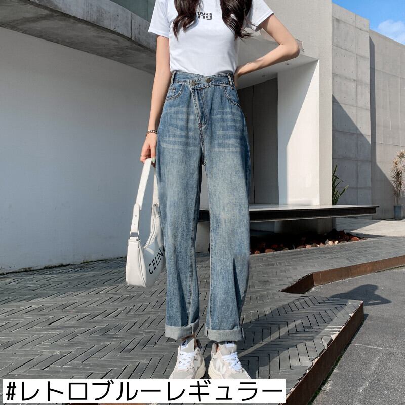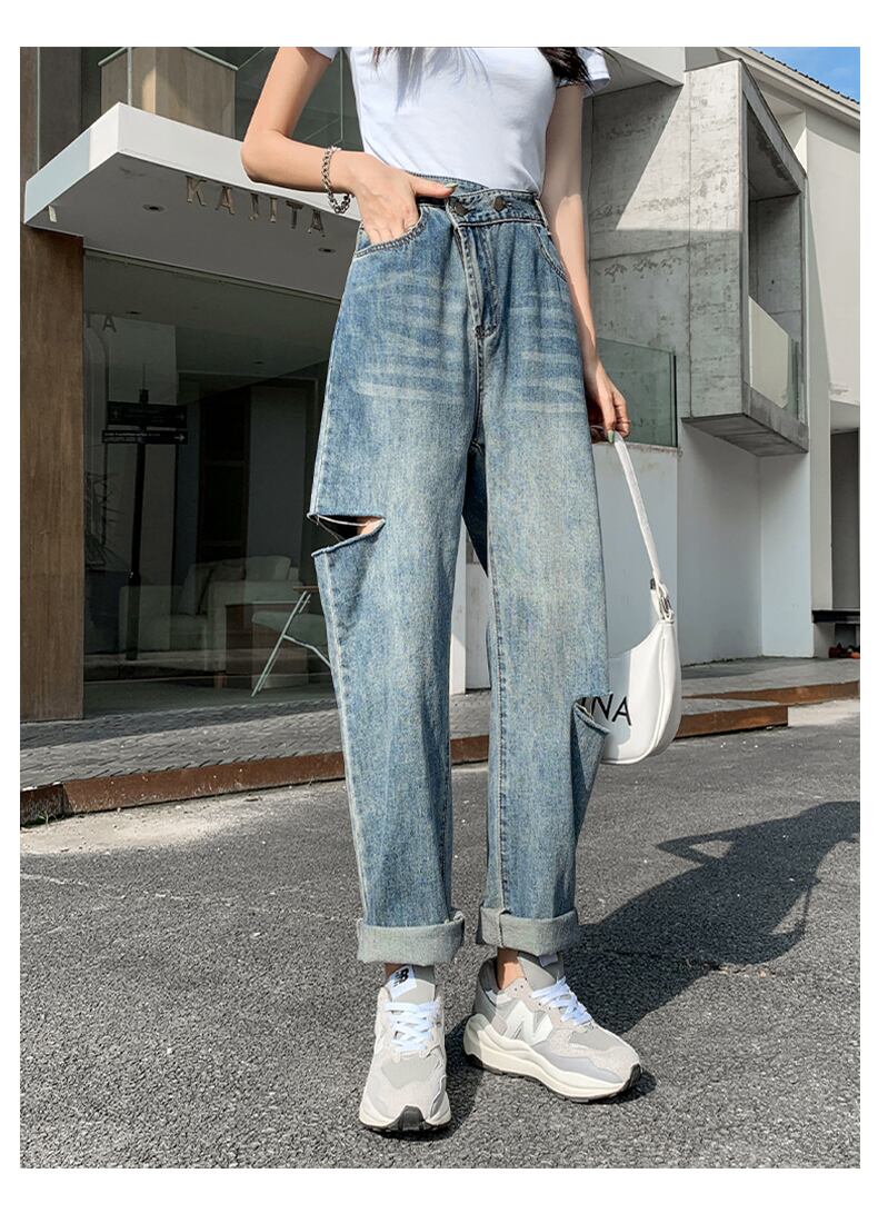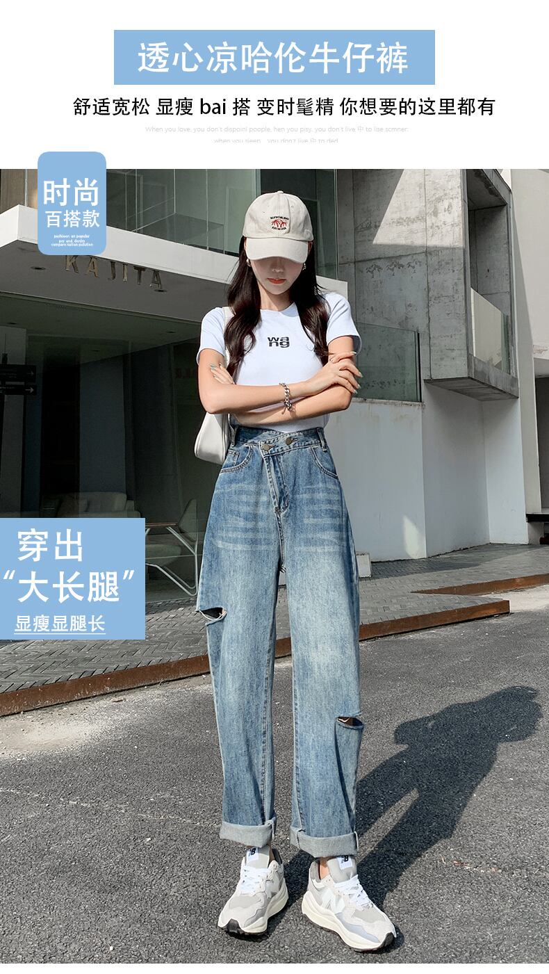 破れたハーレムジーンズレディースサマールーズ2021新しいハイウエストストレートチューブスリミングレトロ9点パパパンツ 夏物 youqi86456912309