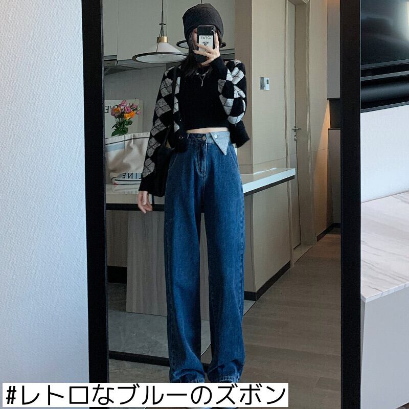 ウエストレトロジーンズレディース春秋デザインセンスニッチストレート秋服2021年新作ワイドレッグパンツ スプリング 春物 オータム 秋物 youqi4501526386