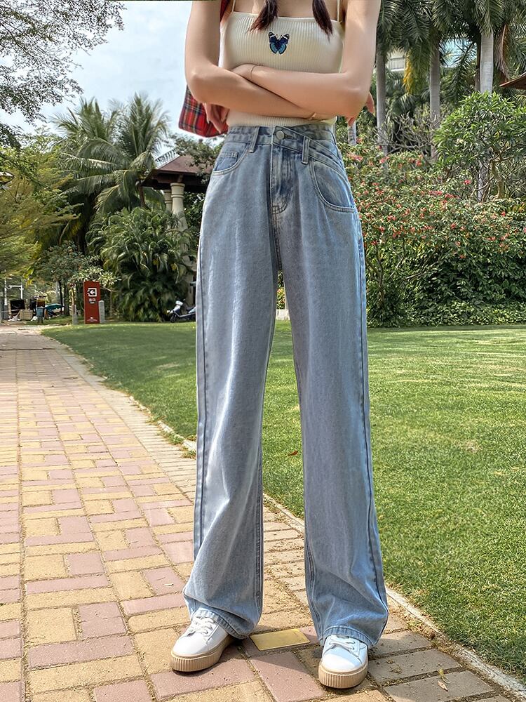 夏の薄手のワイドレッグジーンズレディースクロスウエストハイウエストハイウエスト2021ニュースタイルスリムストレートチューブルーズモップ サマー 夏物 youqi21486596431