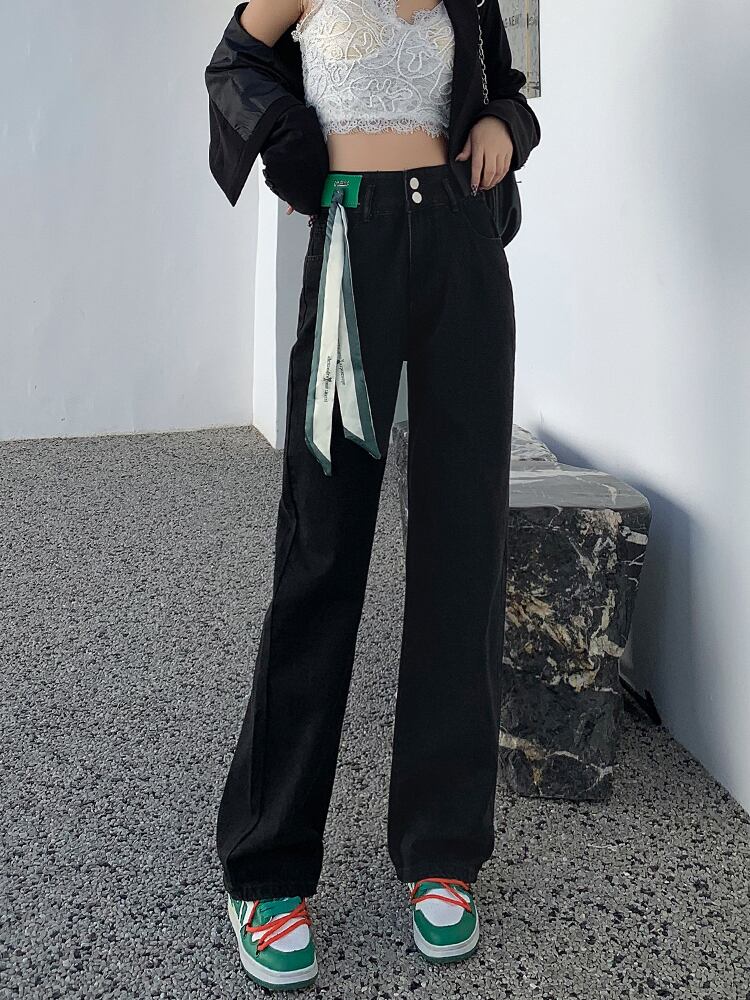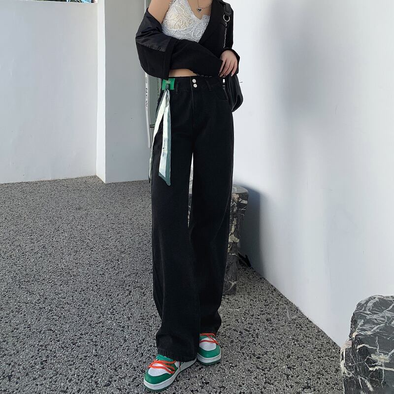 ブラックワイドレッグジーンズレディースハイウエスト春秋ルーズ2021新作スリムストレートレッグニッチデザインパンツ ハイウェスト スプリング 春物 オータム 秋物 youqi27604400030
