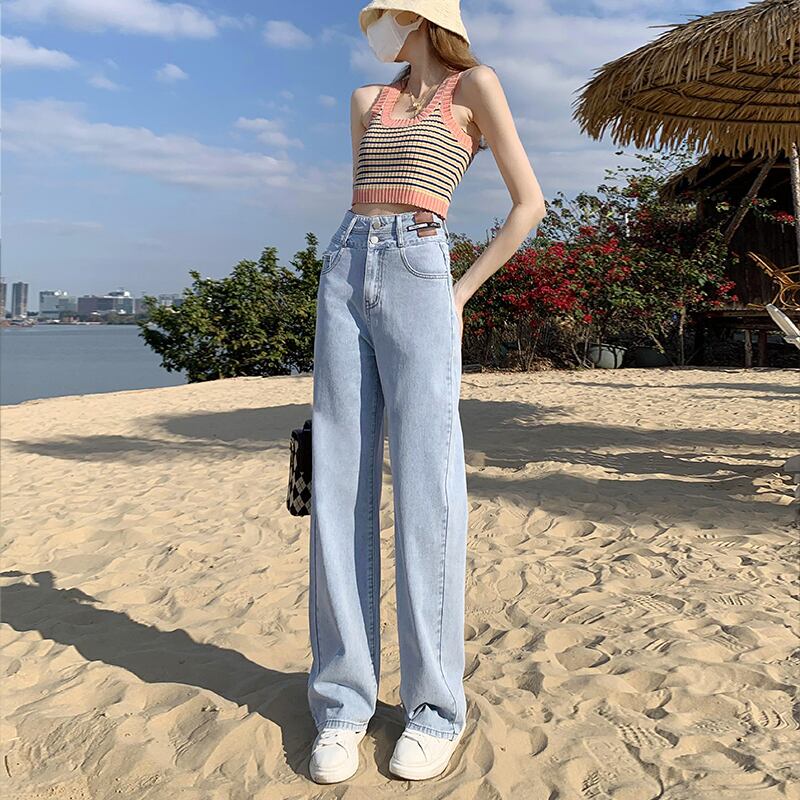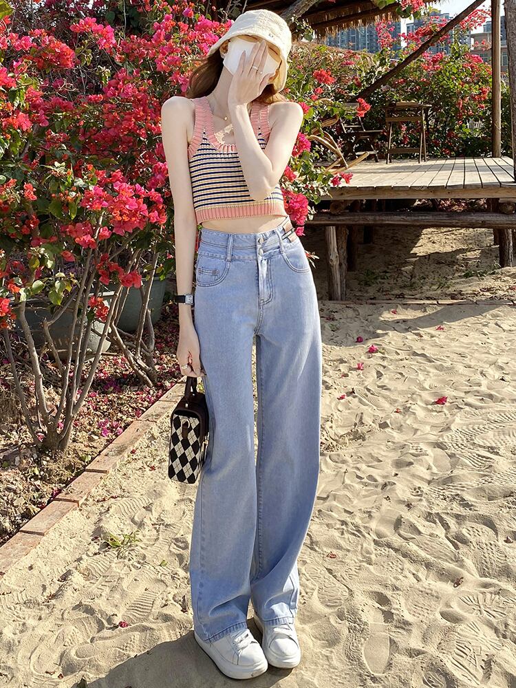 ライトカラーのハイウエストワイドレッグパンツルーズジーンズ2022年春夏新作ドレープデザインストレートチューブモッピングパンツ レッド スプリング 春物 サマー 夏物 youqi63171767186