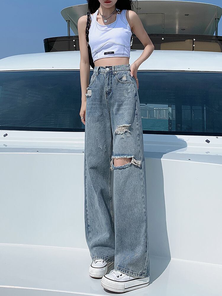 リッピングジーンズレディースハイウエストワイドレッグルーズ春夏2022年新作スリミングデザインストレートモップパンツ ハイウェスト スプリング 春物 サマー 夏物 ワイドパンツ youqi72067519010