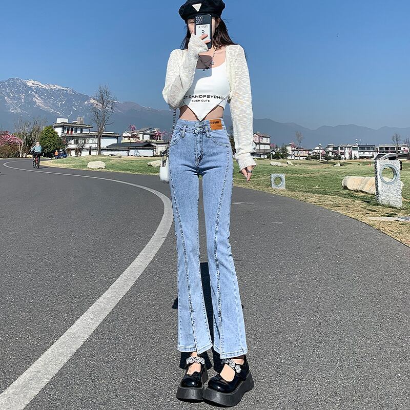 スリットジーンズレディース2022年夏新作ハイウエストタイトフィットシンモップシックマイクロフレアパンツライトカラー サマー 夏物 youqi53655332267