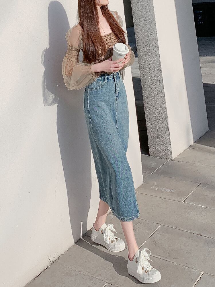 -ウエストデニムスカートレディースミドル丈バージョンは薄く、オールマッチスプリットストレートAラインレディースバッグヒップスカート春夏 スプリング 春物 サマー 夏物 youqi88186638753