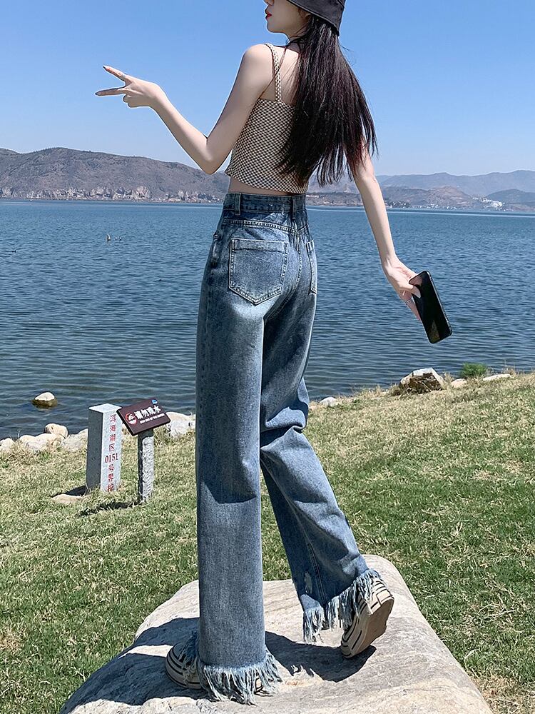 ワイドレッグジーンズレディースドレープローズ夏2022年新作スタイル細身ハイウエスト学生乞食パーソナリティモップパンツ サマー 夏物 youqi9846941298