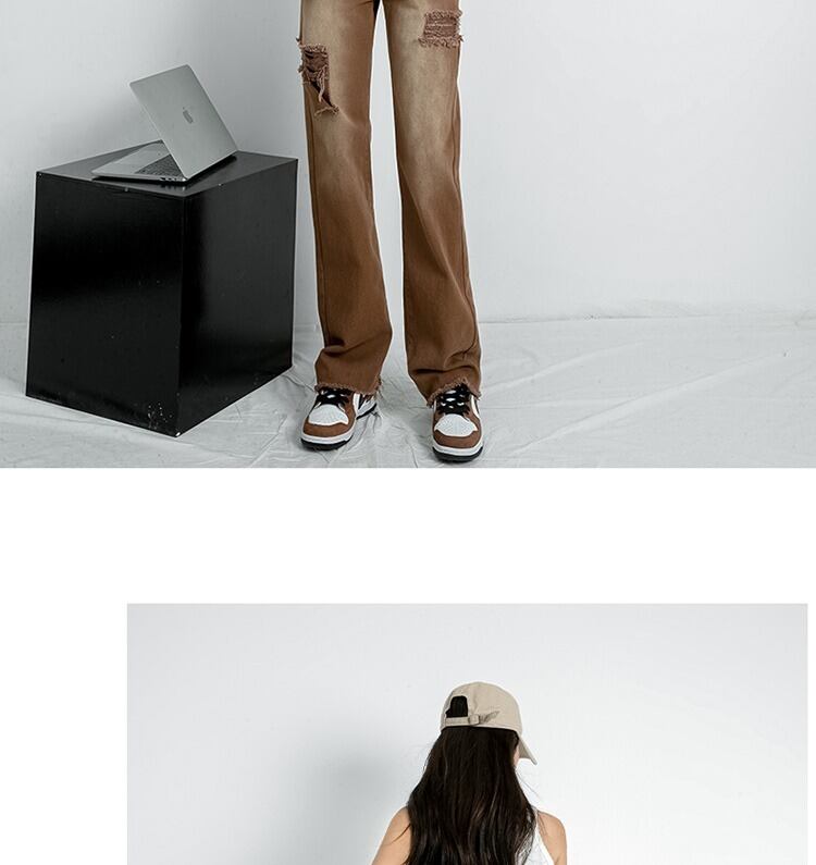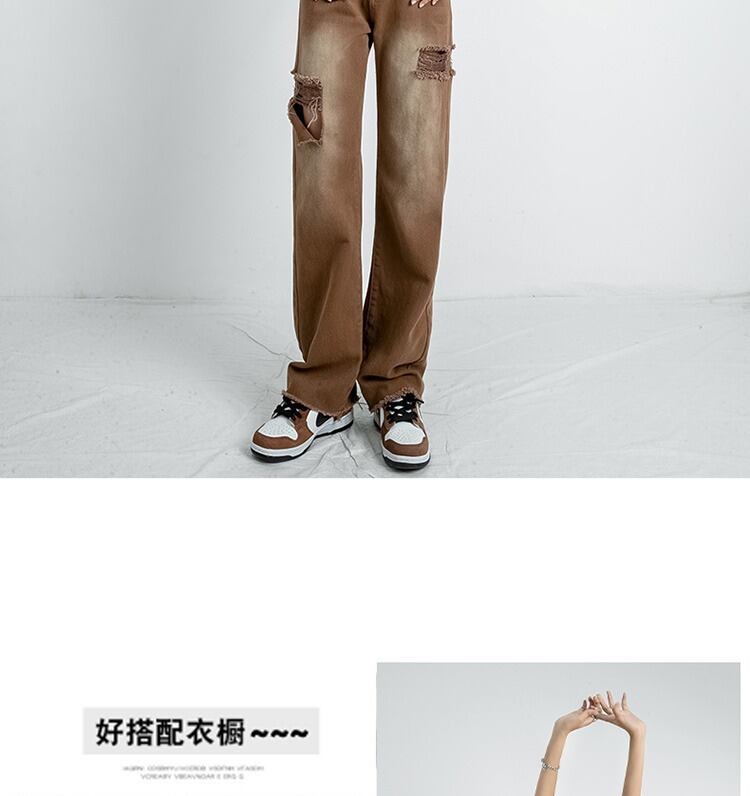 ブラウンリッピングジーンズレディースストレートルーズルーズサマーシンセクショングラデーションアメリカンハイウエストハイストリートバイブスタイルパンツトレンド ハイウェスト 夏物 youqi12431071352