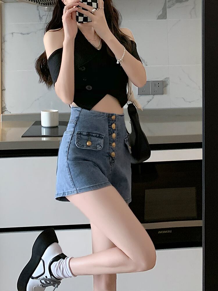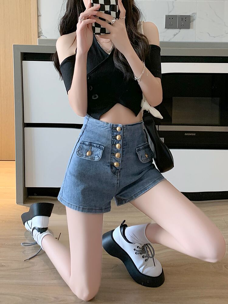 2022年夏の新作ハイウエストシンエラスティックオールマッチパンツバージョンブレストa-wordパーソナリティデニムショーツレディース 伸縮 サマー 夏物 ブルマー youqi47221501083