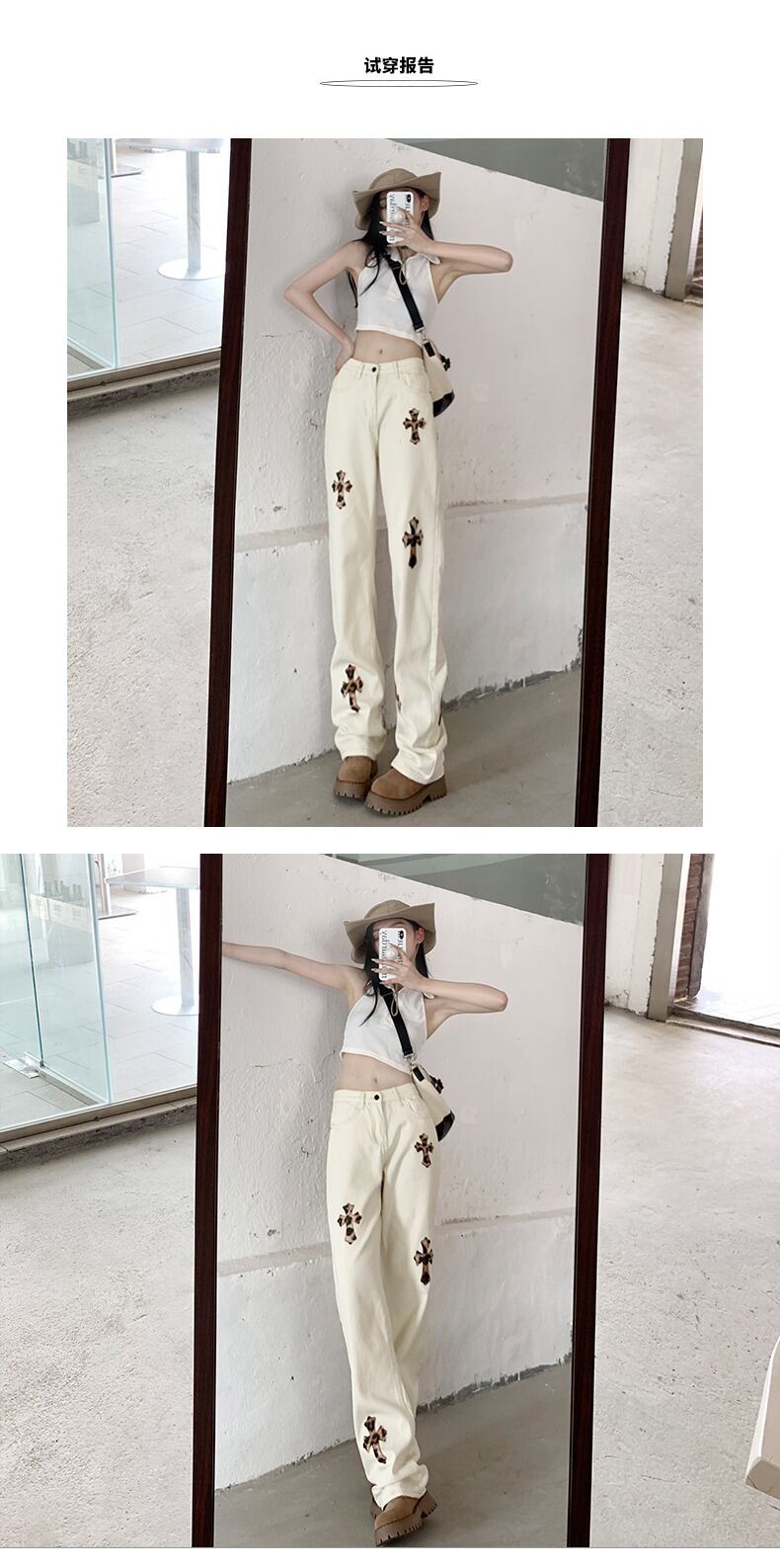 ホワイトクロスジーンズレディースルーズストレート2022年新作ハイウエストスリムワイドレッグデザインモップパンツ youqi7761410434