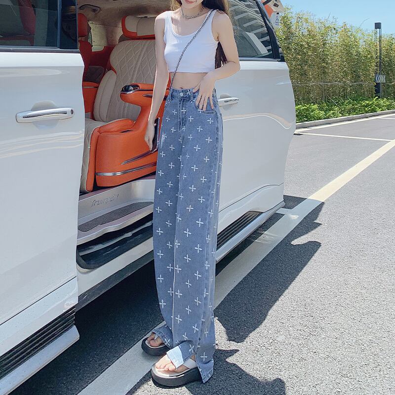 プリントジーンズレディーススプリットストレートサマーシンセクションハイウエストシンクロスオールマッチデザインモップパンツ ハイウェスト 夏物 youqi34998319686