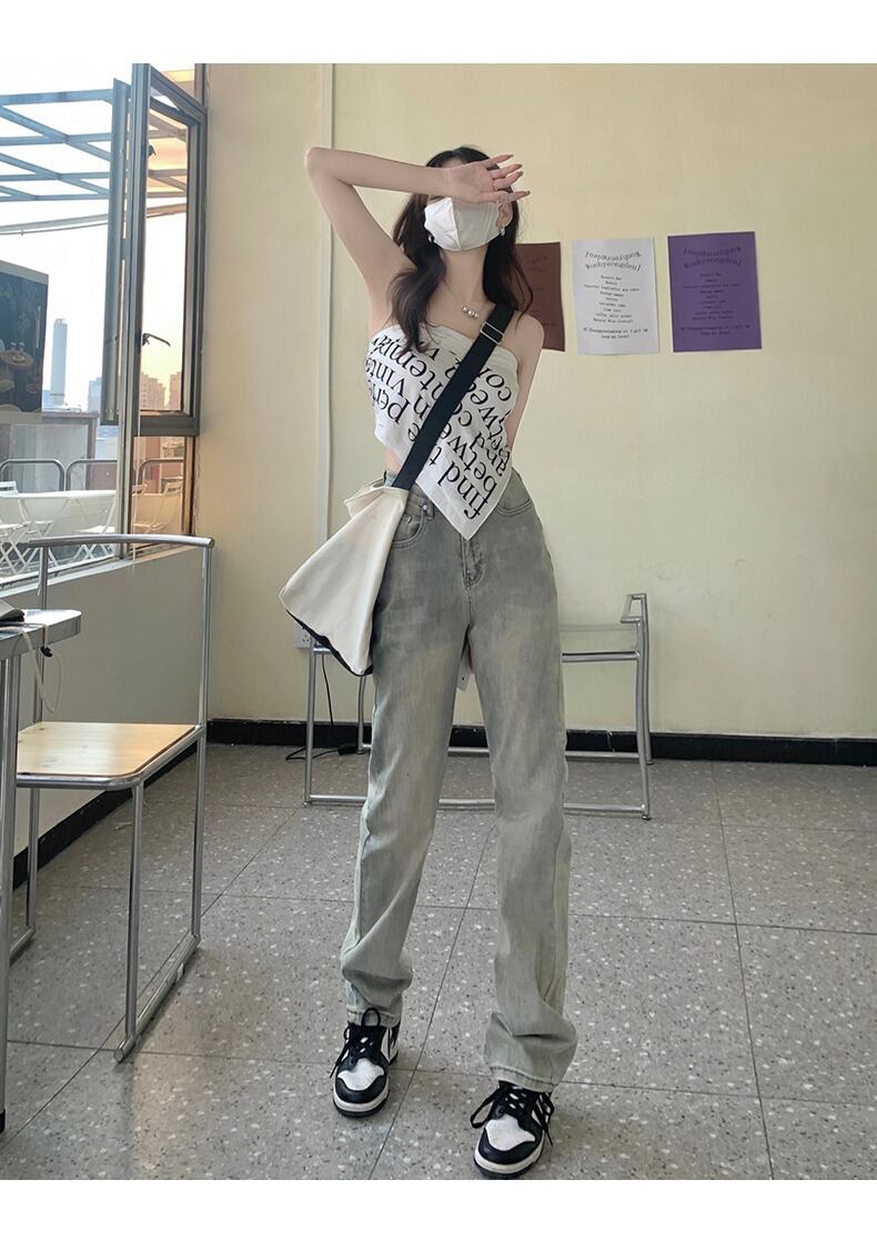 レトロストリートジーンズレディースストレートウォッシュオールドサマー薄片ルーズウエストイエローマッド縦長パンツタイド ロング 夏物 youqi57349806026