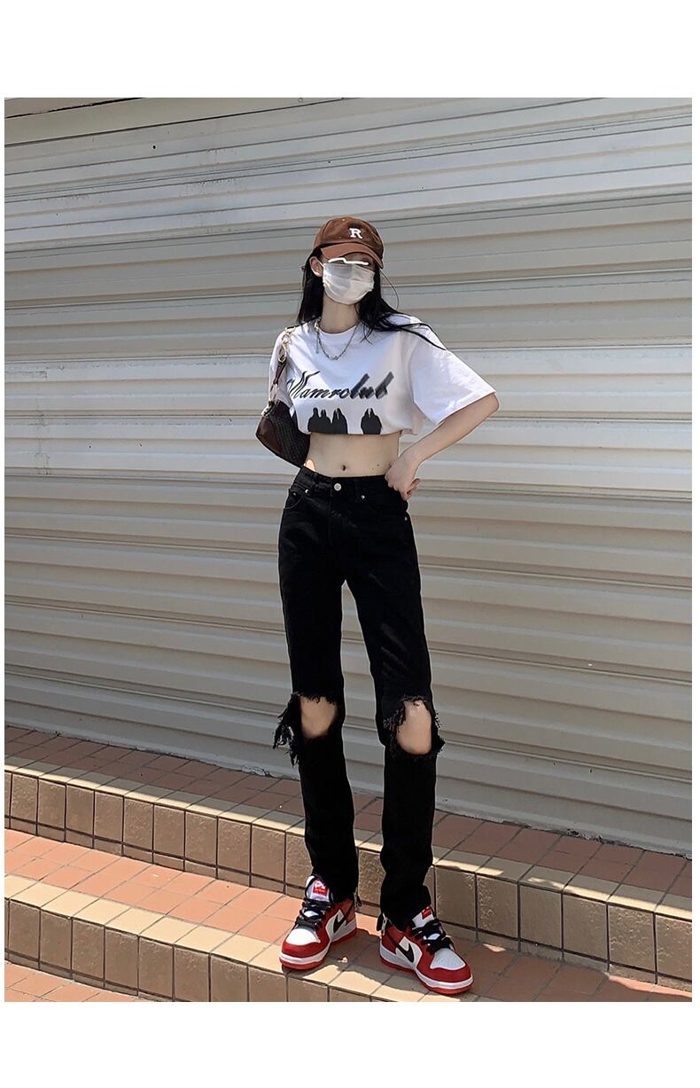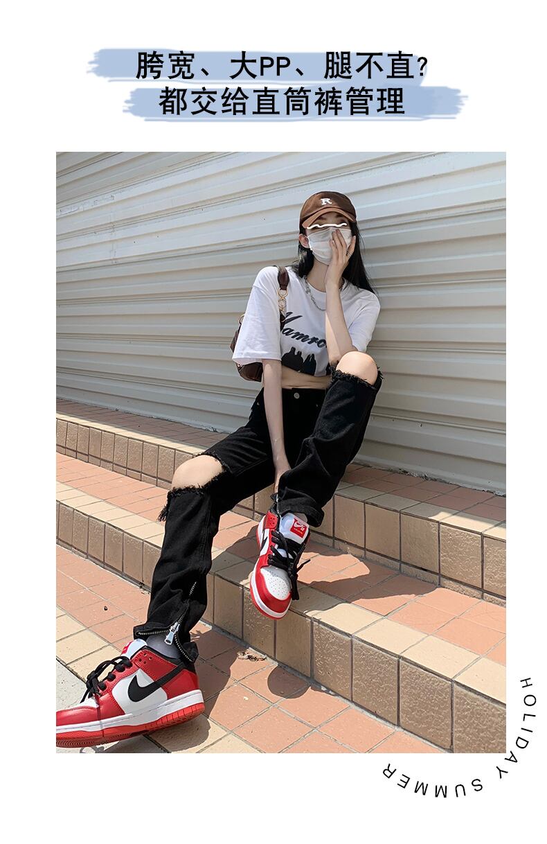 ブラックリッピングストレートジーンズ女性ハイウエストハイストリートタイドイン乞食パーソナリティヒップホップフライドストリートパンツ ハイウェスト youqi36724274539