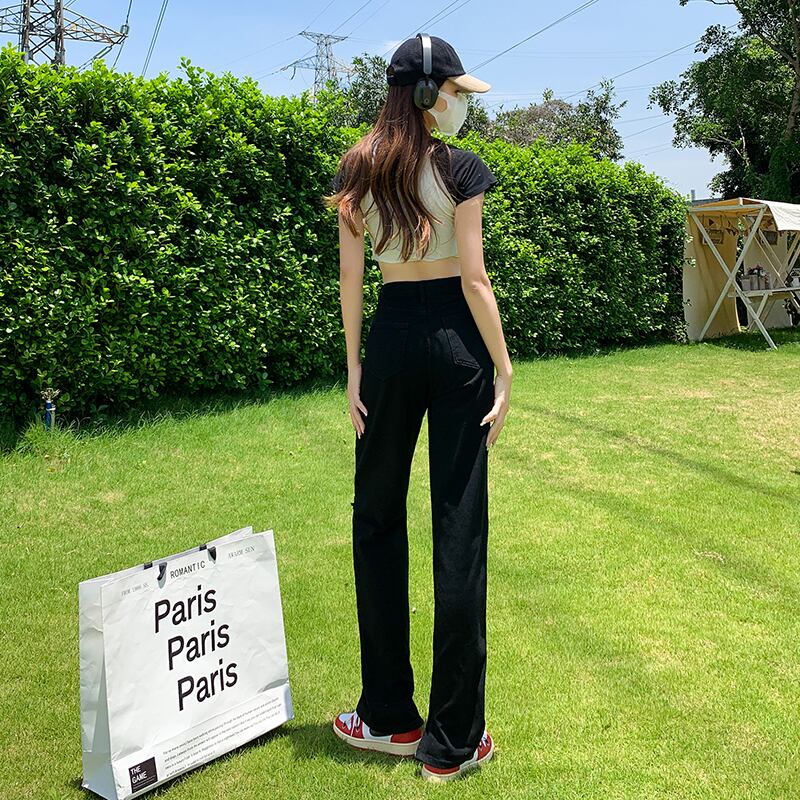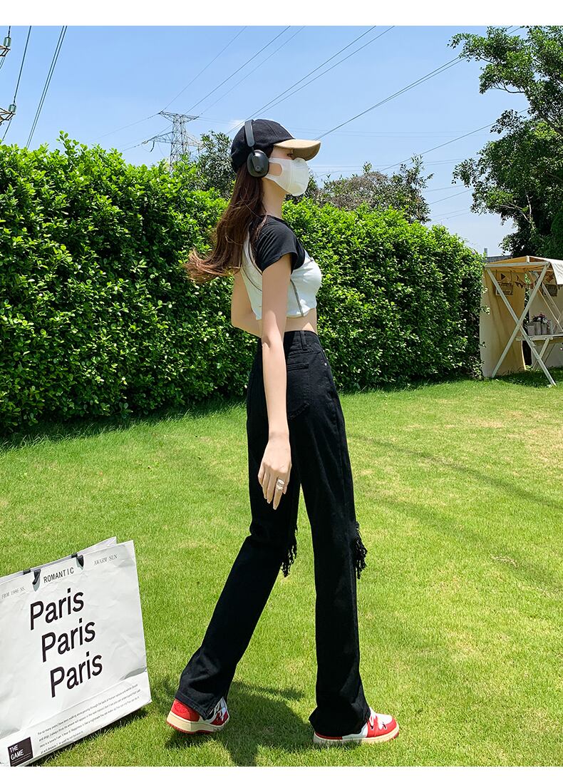 ブラックリップドジーンズレディースサイドジッパーストレートハイウエストスリムで用途の広い2022年新作パンツ ハイウェスト youqi2676885685