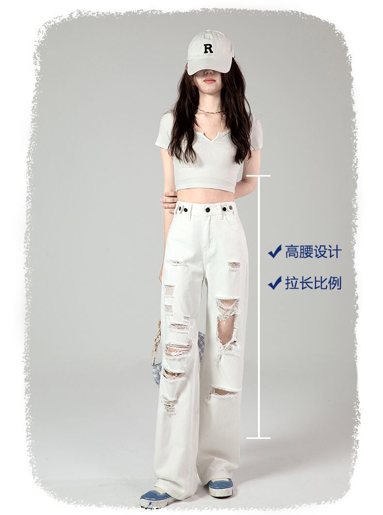 ホワイトタイドブランド腐った穴ジーンズ女性ストレートハイストリート薄い乞食カジュアルドレープワイドレッグモップパンツ潮 ワイドパンツ youqi37472029919