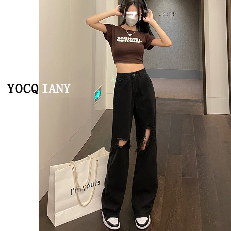黒の破れたジーンズ女性のハイストリートpphomeルーズワイドレッグ2022サマードレープ細いストレートチューブ床を拭く ブラック 夏物 youqi1547911288