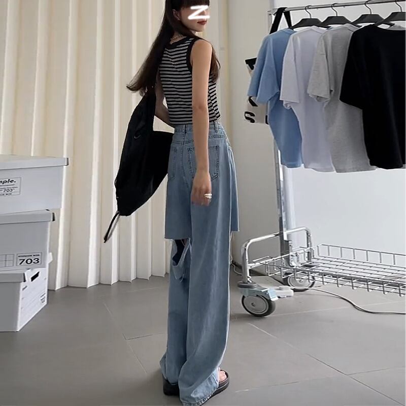 フロントとリアの破れたワイドレッグジーンズの女性の垂れ下がったハイウエストの夏の薄片は薄くて明るい色の乞食が床のストレートパンツの潮を拭いていました ハイウェスト レッド サマー 夏物 youqi52788843411