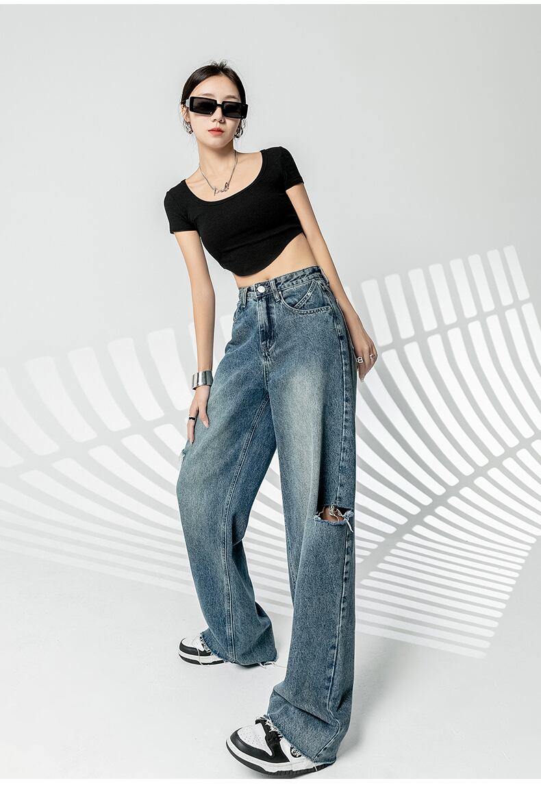 ワイドレッグジーンズレディースたるみハイウエストルーズ左右カット2022年夏新流行ハイストリートパンツ ハイウェスト サマー 夏物 youqi8563351734