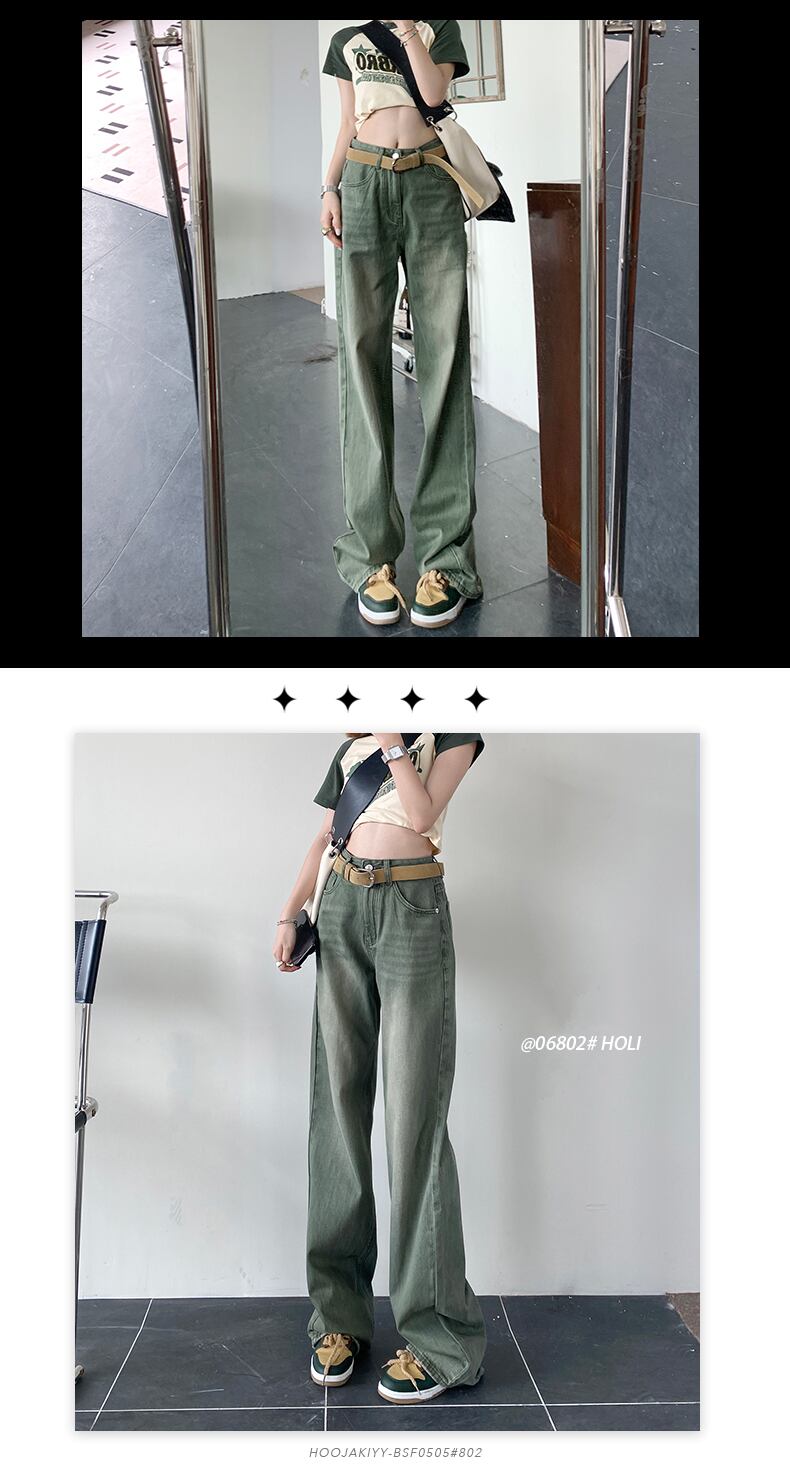 グリーンワイドレッグジーンズレディースドレープサマールーズ2022ニュースタイルシンハイウエストストレートレッグモップロングパンツ 夏物 youqi87650178147