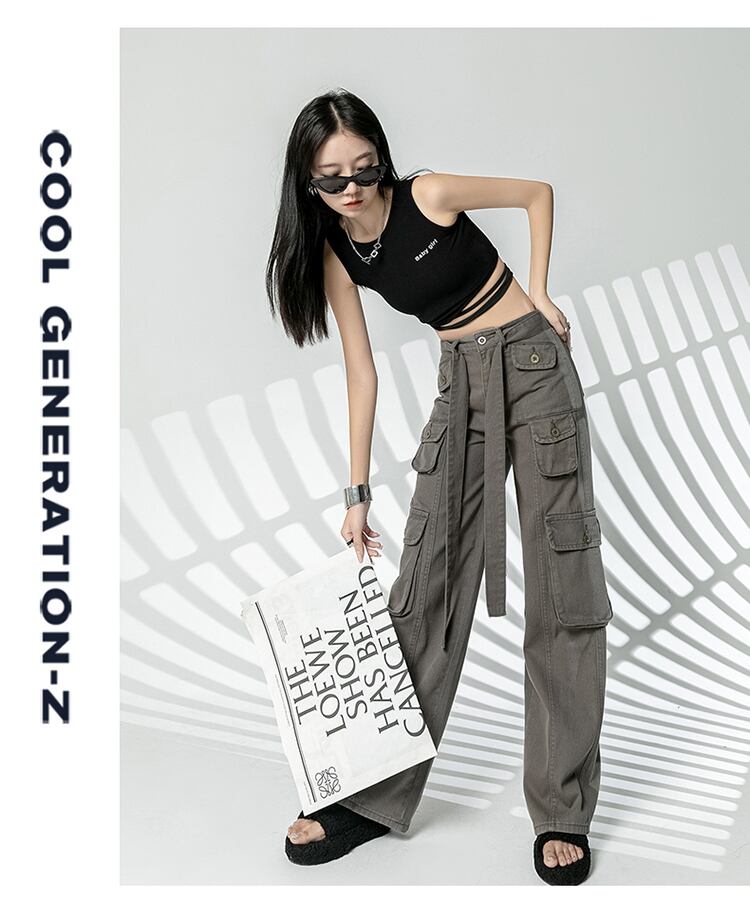 グレーグリーンのオーバーオール女性の2022年夏の新しいオールマッチハイストリートドレープワイドレッグバイブカジュアルパンツが延長されました サマー 夏物 youqi33231630853