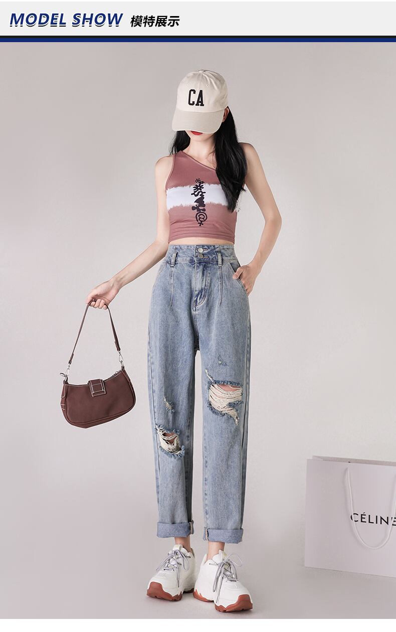 レトロなノスタルジックなハーレムジーンズレディース9ポイントハイウエスト2022年夏薄手のニュースタイルリッピングパパパンツテーパードパンツ ハイウェスト レッド サマー 夏物 youqi39091934328