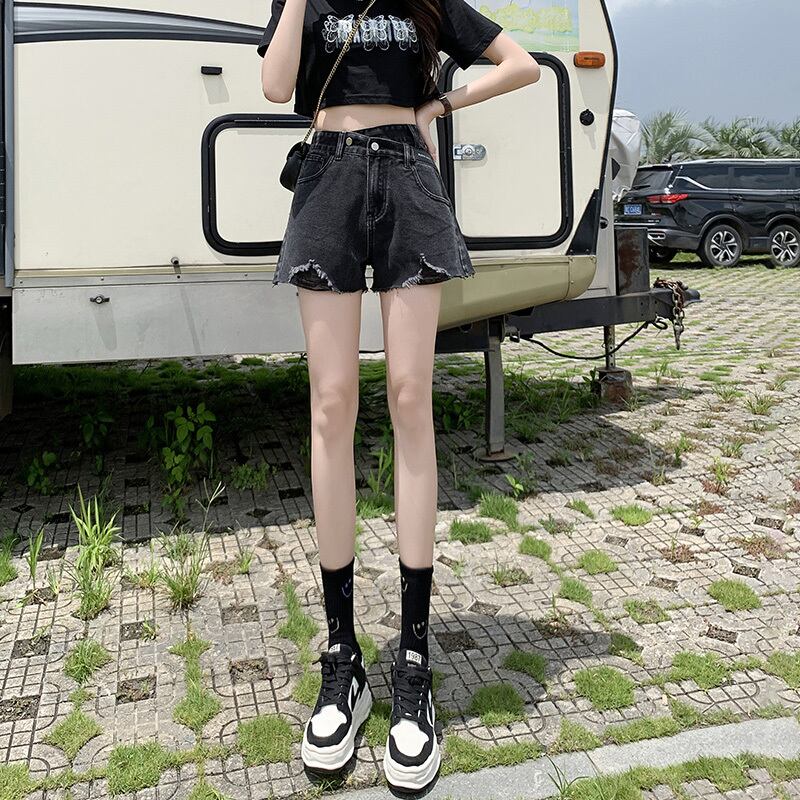 ブラックグレーハイウエストデニムショーツレディースサマー薄切片転位不規則オールマッチワイドレッグ細Aラインパンツトレンド ハイウェスト 夏物 ブルマー youqi72536580931