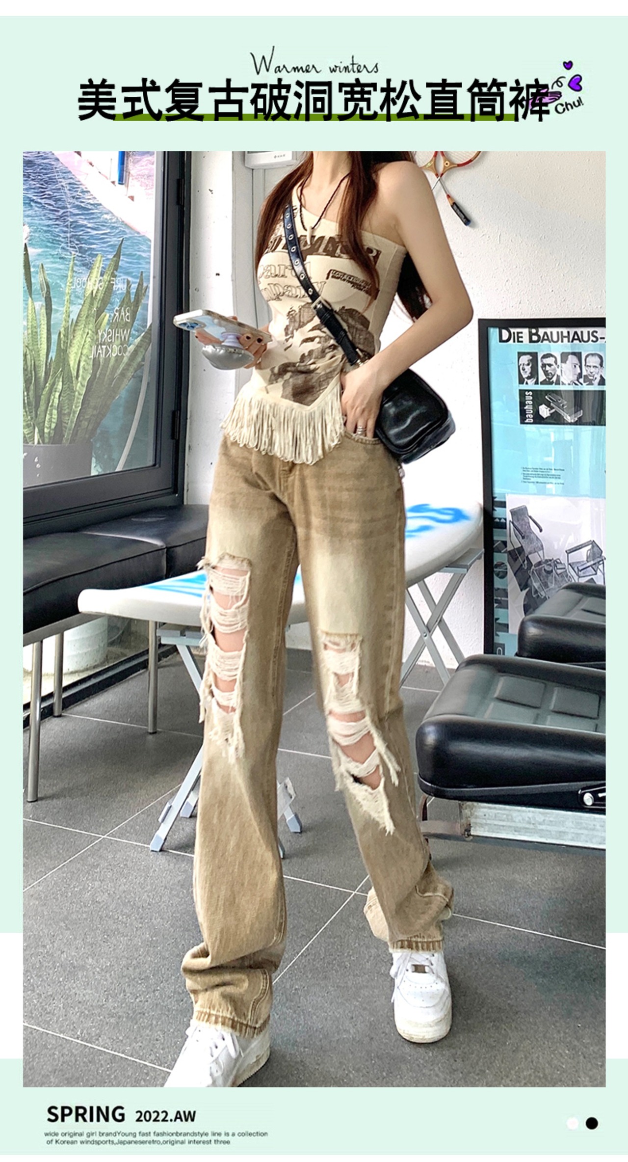 アメリカンバイブ レトロ デザート イエロー ホール ルーズ ストレート ジーンズ 女性 ストリート 新作 夏 ハイウエスト 細め ハイウェスト サマー 夏物 youqi49520591478