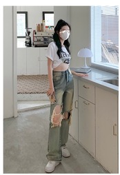 アメリカンスタイル スラグ風 ビッグホール ジーンズ レディース ワイドレッグ ストレート ウォッシュ ホワイト ゆったり 薄手 2022年夏新作 サマー 夏物 youqi83699082987