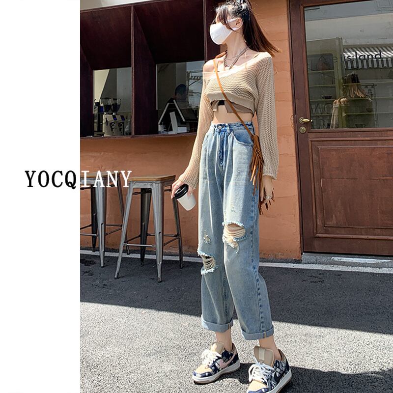 ジーンズ レディース 夏 ハイウエスト おしゃれ 折り返し レトロ ノスタルジック テーパード パンツ 破れ穴 痩身 美脚 ロング ハーレムパンツ レッド サマー 夏物 youqi63747503499
