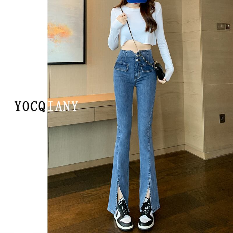 レトロ ブルー スリット ジーンズ女性の夏 2022 新しいハイウエスト タイト フィット スリム モップ シックなマイクロ フレア パンツ サマー 夏物 youqi81723148861