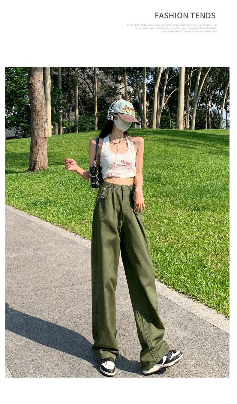 ヨーロッパとアメリカのルーズアーミーグリーンオーバーオールジーンズ女性のハイウエストドレープハイストリートインワイドレッグ 2022 夏の新 ハイウェスト サマー 夏物 ワイドパンツ ヨーロピアン youqi1139555549