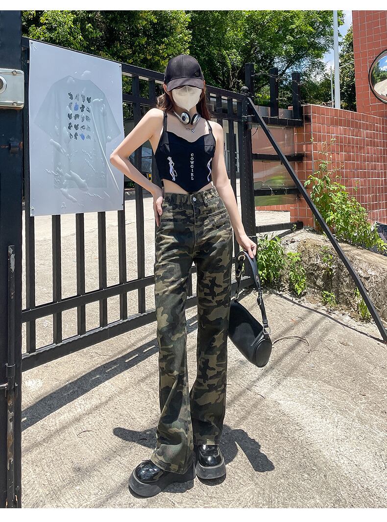 アメリカのレトロなカモフラージュ オーバーオール 2022 女性の夏のハイ ウエスト スリム マイクロ フレア ジーンズ ショー長い脚 ハイウェスト ロング レッド サマー 夏物 youqi5616995792