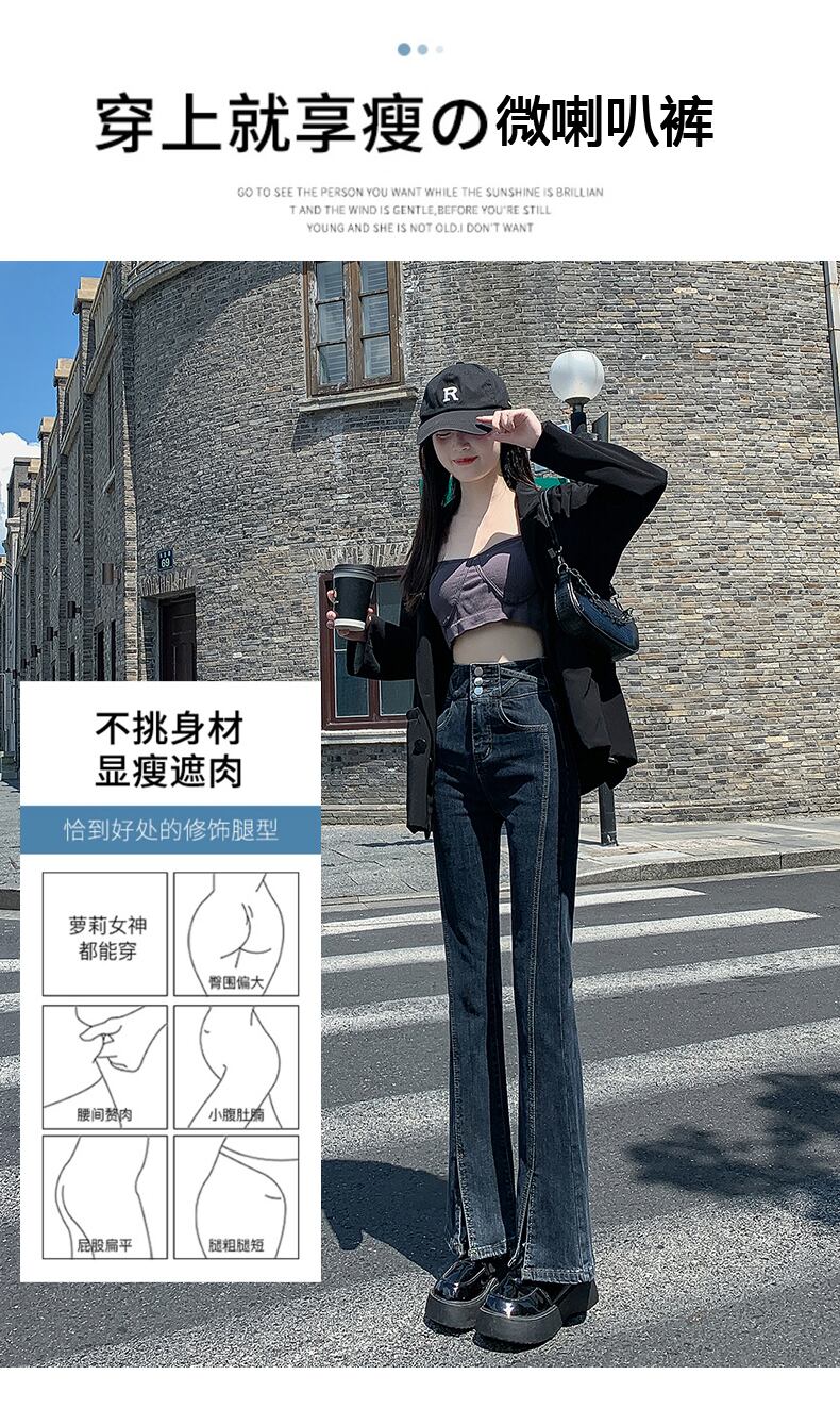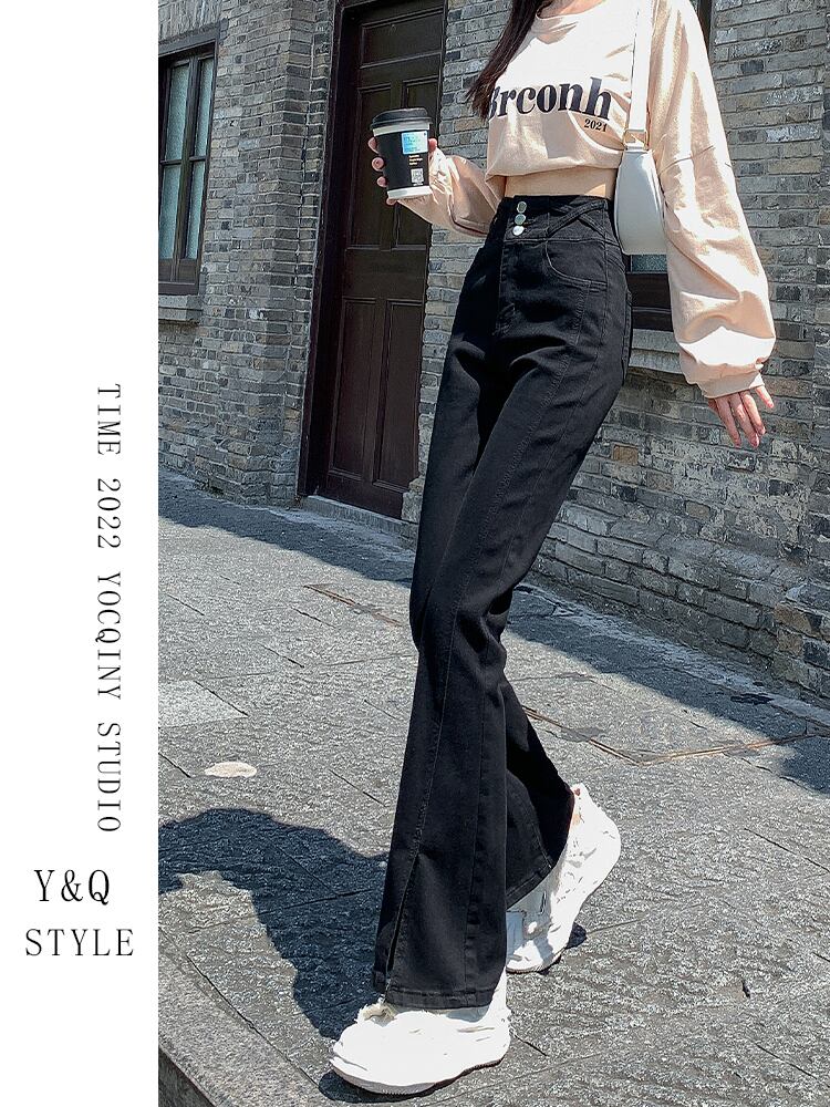 フリード ストリート マイクロフレア ジーンズ ヨーロッパとアメリカのホット ガールズ スプリット ウエスト ショー シン ショー スリム ストレッチ ブラック パンツ サマー 夏物 ヨーロピアン youqi17095513629