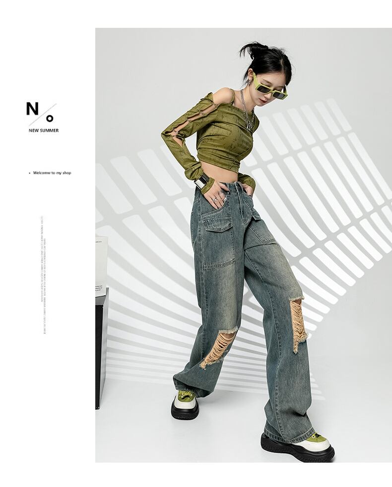 ウエスト リップド ストレート ワイドレッグ ジーンズ 女性用 ハイストリート ニッチ デザイン モップ 新しい ヒップホップ スリム レトロ ブルー youqi26438820727