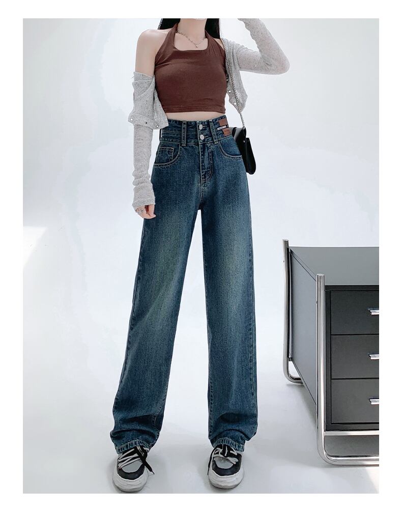 ウエスト ノスタルジック レトロ ブルー ゆったり デザイン レザー ブランド ワイドレッグ ドレープ ストレート ジーンズ トレンド ストリート ヒップホップ ワイドパンツ youqi37516094349