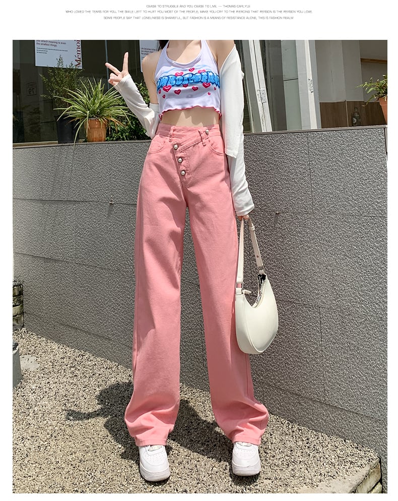 アメリカの甘くてスパイシーなスタイルのハイウエストモップパンツクロスウエストピンクの遊び心のあるジーンズ女性の夏の細くて長い脚 ロング 大人ガーリー スウィート キュート カジュアル サマー 夏物 youqi68127916470
