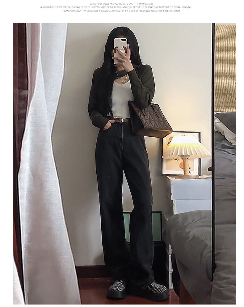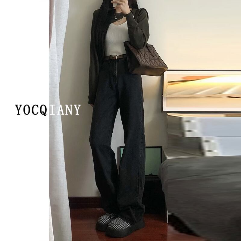 ブラック グレー ワイドレッグ パンツ デニム レディース ハイウエスト たるみ 2022年 秋の新作 初秋着 床をモップするのに薄くてまっすぐに見えます オータム 秋物 youqi11313391255