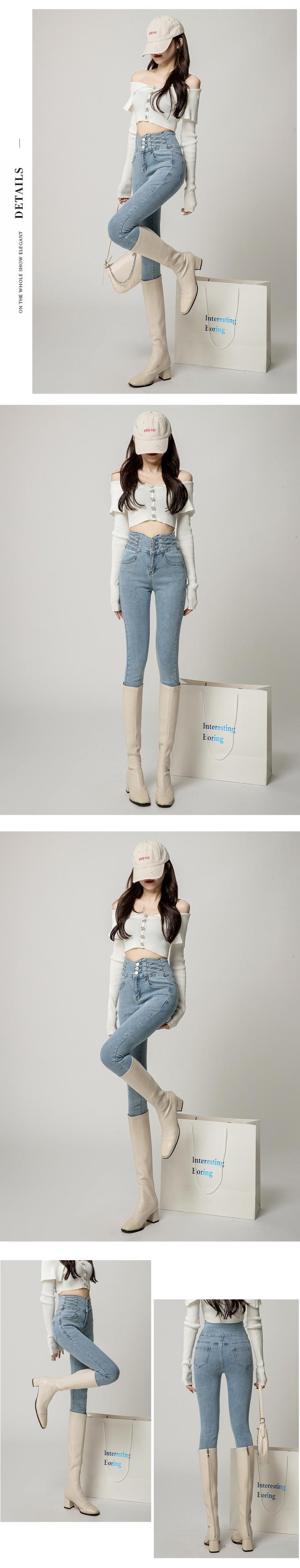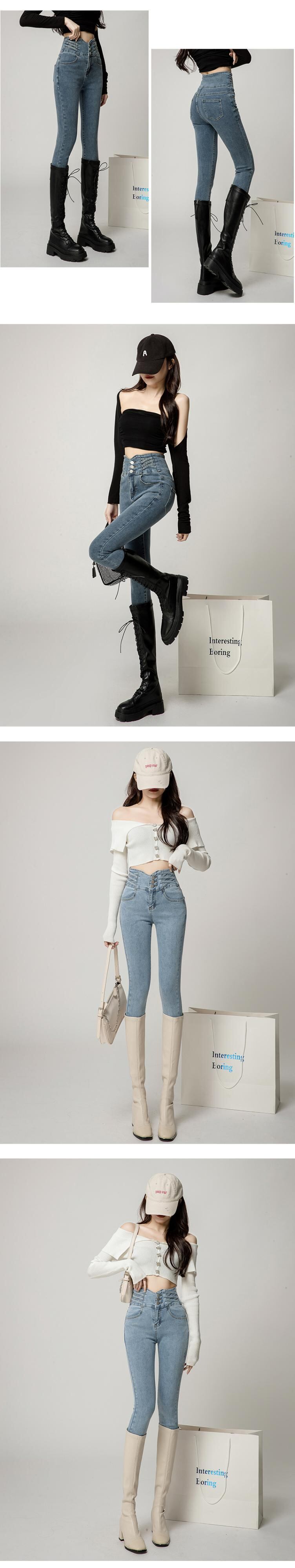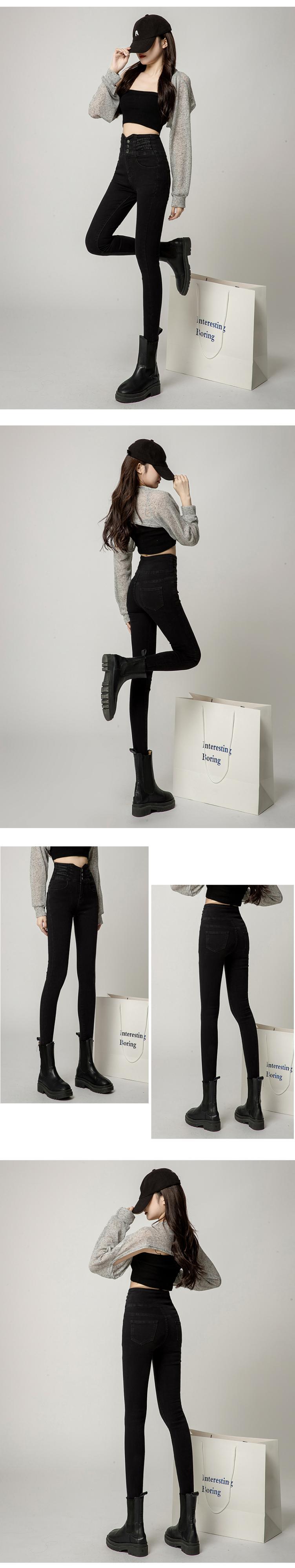 黒ハイストリート 2022 秋と冬の新しい弾性ペンシルパンツ女性のスリムスリムハイウエストジーンズマルチボタンデザイン ハイウェスト ブラック エラスティック 伸縮 オータム 秋物 ウィンター 冬物 youqi55943574249