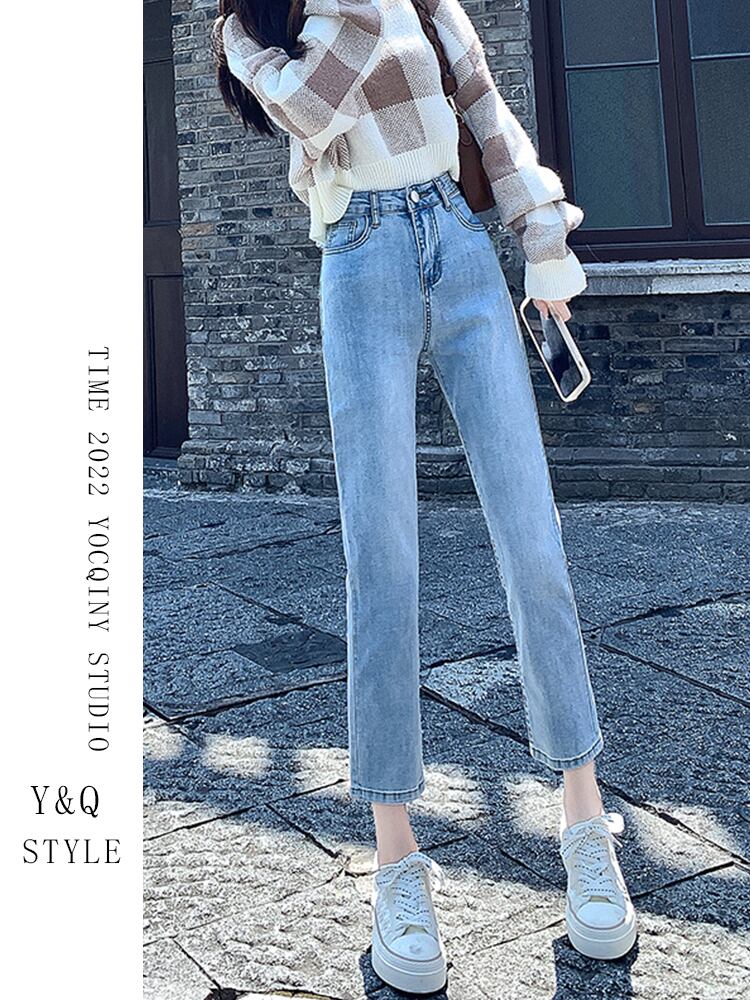 シックな気質のハイウエスト ストレート ジーンズ女性の水色の秋スリム オール マッチ小さな 9 点シガレット パンツ ハイウェスト ブルー オータム 秋物 youqi54707055741