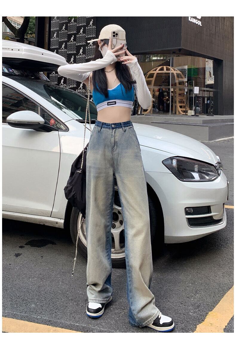 バイブスタイル グラデーションカラー 個性的なステッチ ワイドレッグ ハイウエスト ジーンズ レディース 秋の新作 ルーズストレート ドレープ 床拭き オータム 秋物 youqi4425504967
