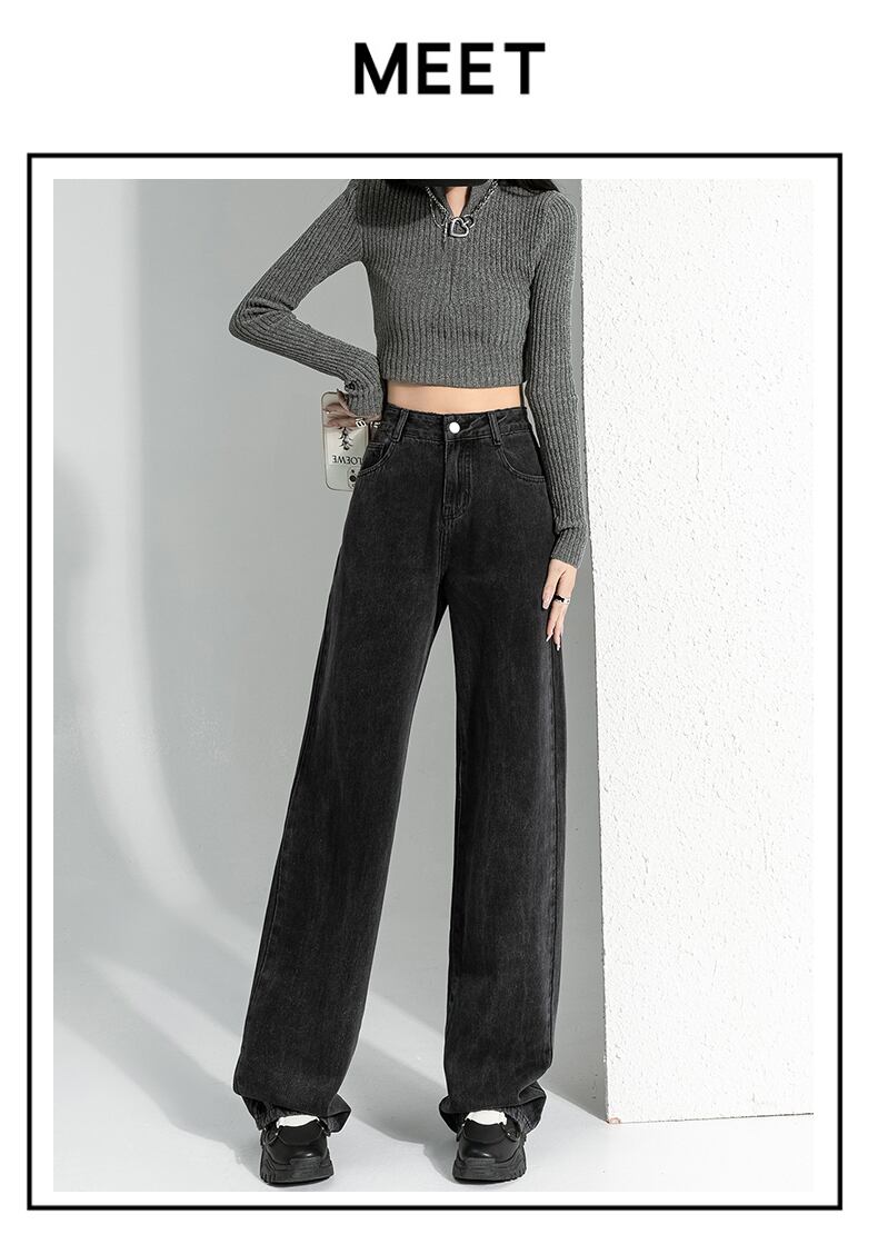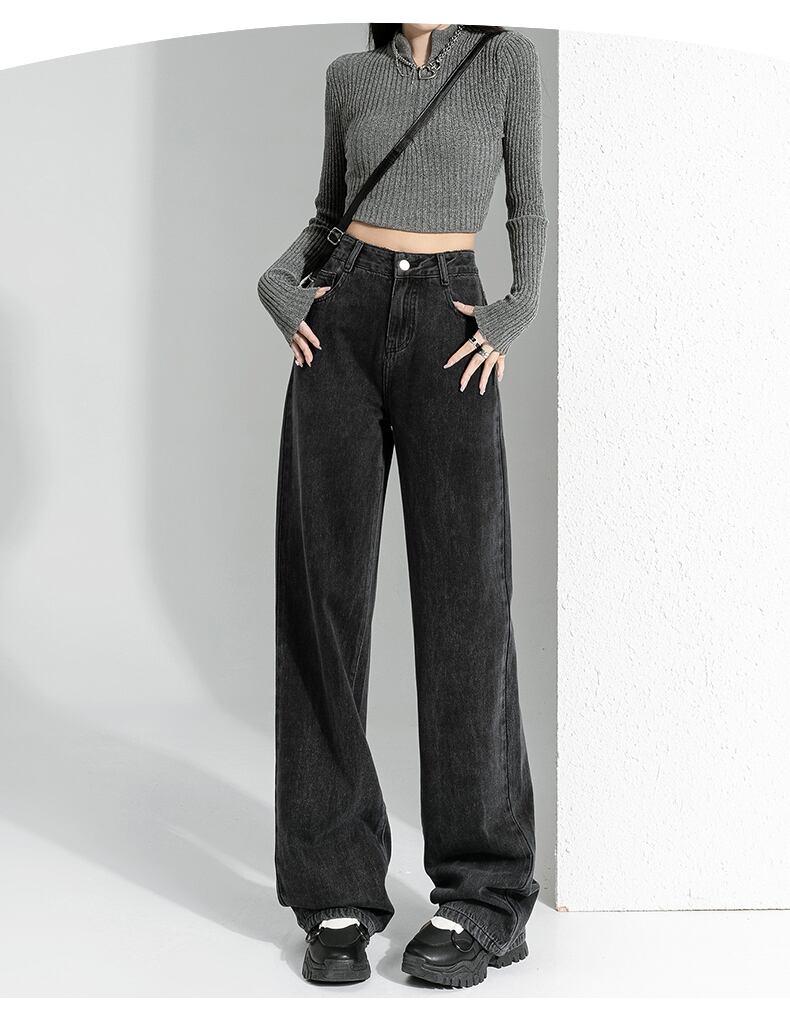ブラック グレー ハイウエスト ワイドレッグ ジーンズ レディース 初秋 2022 新しい ルーズでドレープ ストレートレッグ パンツ 秋服 オータム 秋物 youqi94751932191