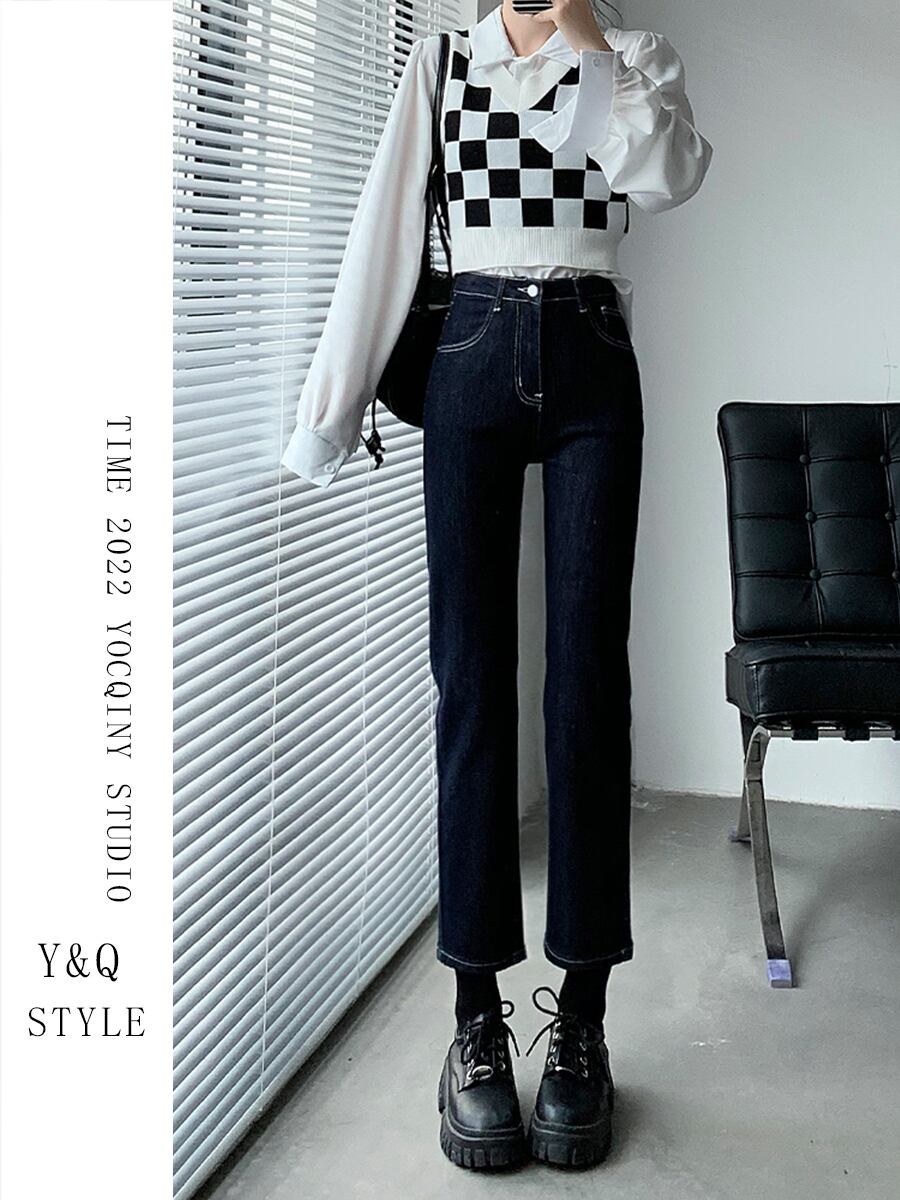 ダークブルーストレートレッグパンツデニム女性ハイウエストルーズ 2022 初秋の新スタイル痩身 9 点タバコパイプパンツ秋服 ハイウェスト オータム 秋物 youqi19032511047