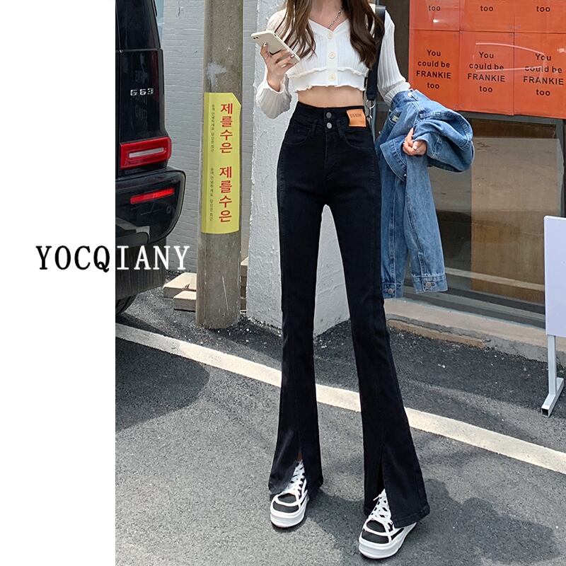 ブラックフロントスリットマイクロフレアパンツハイウエストジーンズレディース春秋ダブルボタンウエストニッチデザインスモール九点パンツ ハイウェスト レッド スプリング 春物 オータム 秋物 youqi33088517629